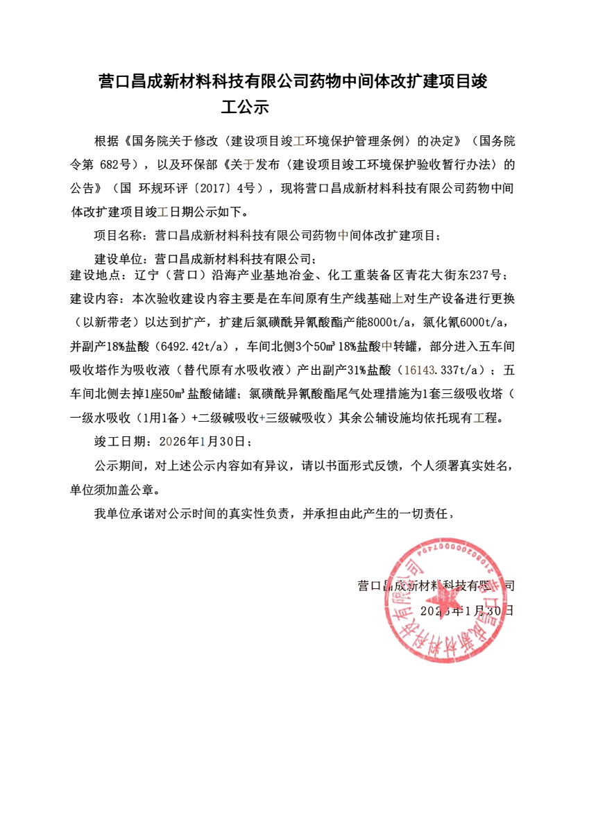 營(yíng)口昌成新材料科技有限公司藥物中間體改擴(kuò)建項(xiàng)目竣工公示